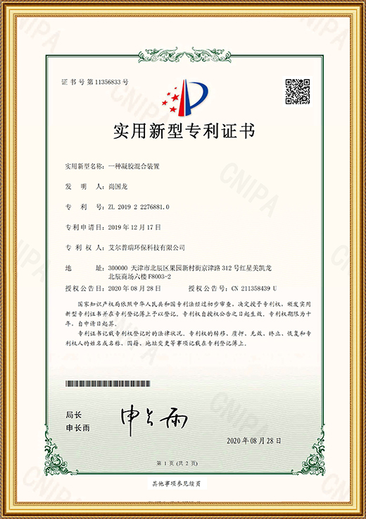 • 實用新型專利證書(一種甲醛清除劑的原料混合